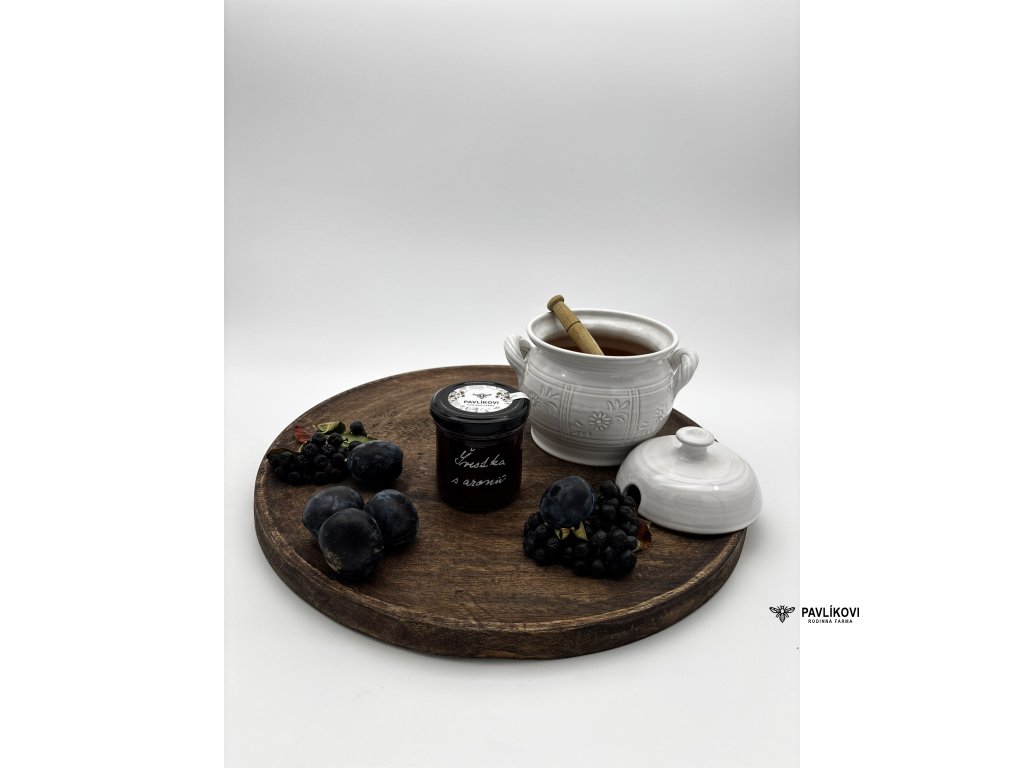 Složení: švestky, aronie (černý jeřáb), květový med, pektin, skořice, kyselina citronová, hřebíček.